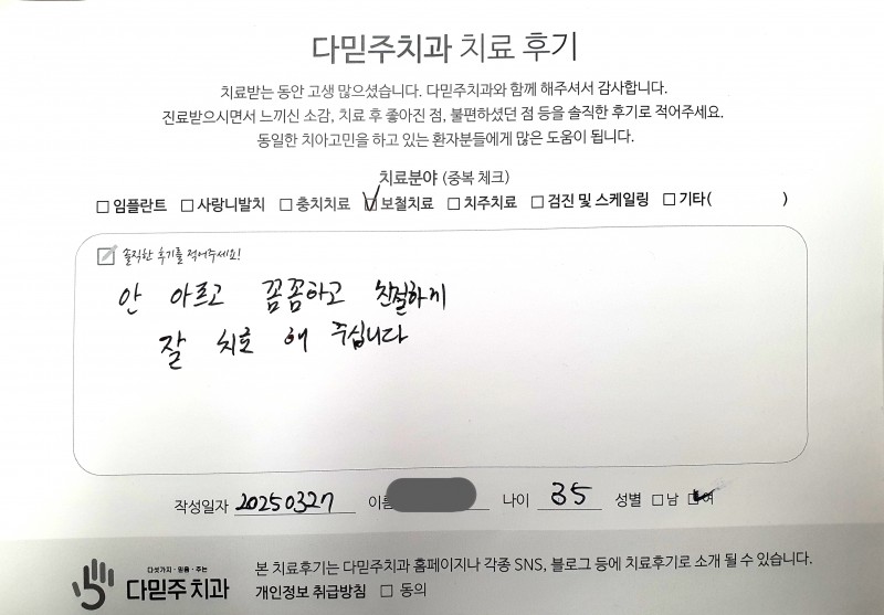 김○○ 님의 보철치료 자필 후기입니다.