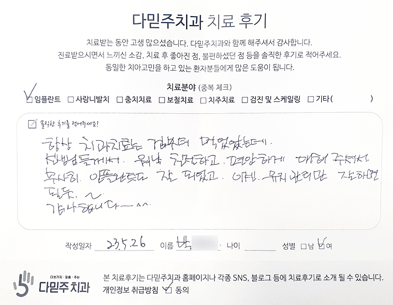박ㅇㅇ님 임플란트 생생후기입니다.